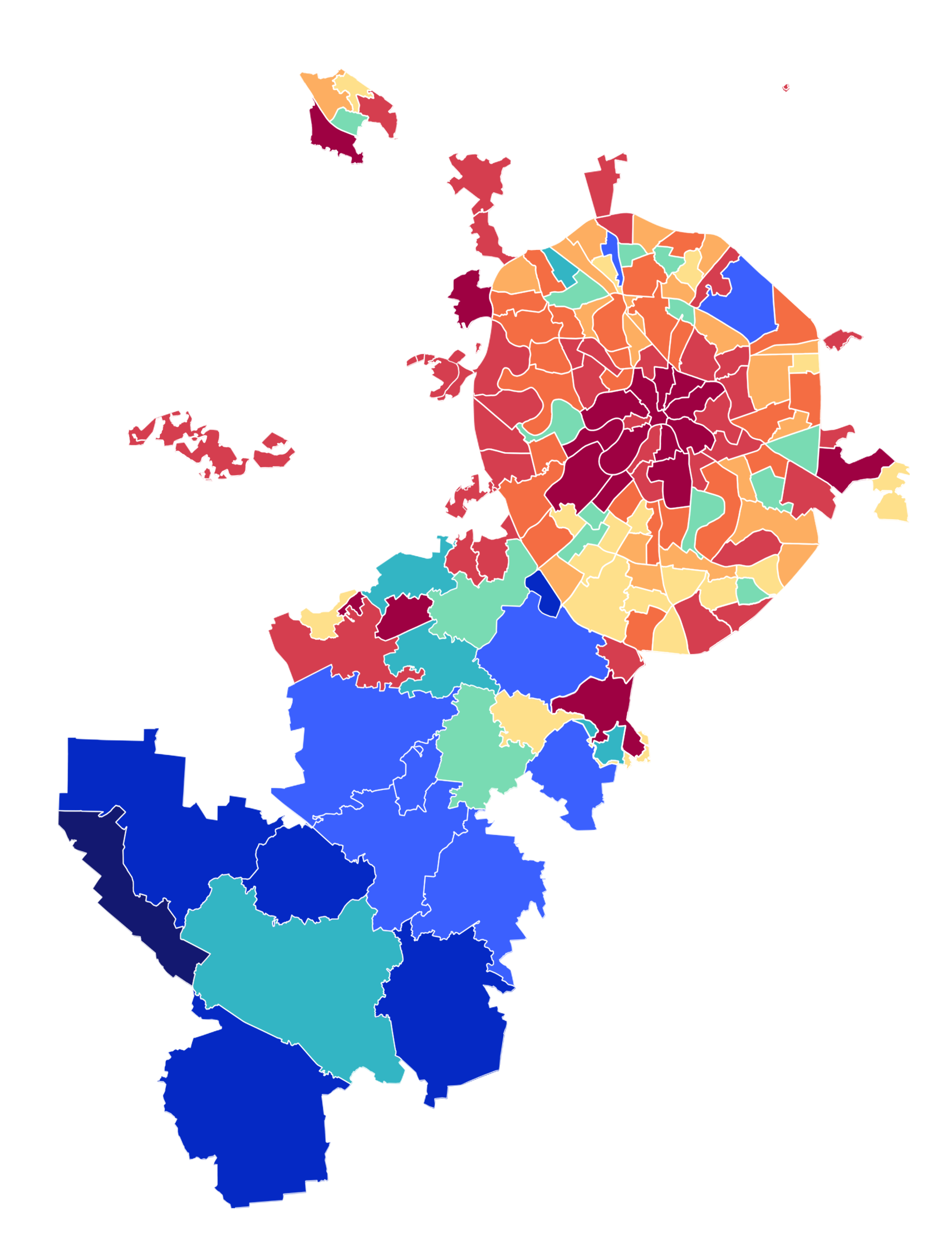 Посмотрим как распределились значения для всех районов на карте Москвы