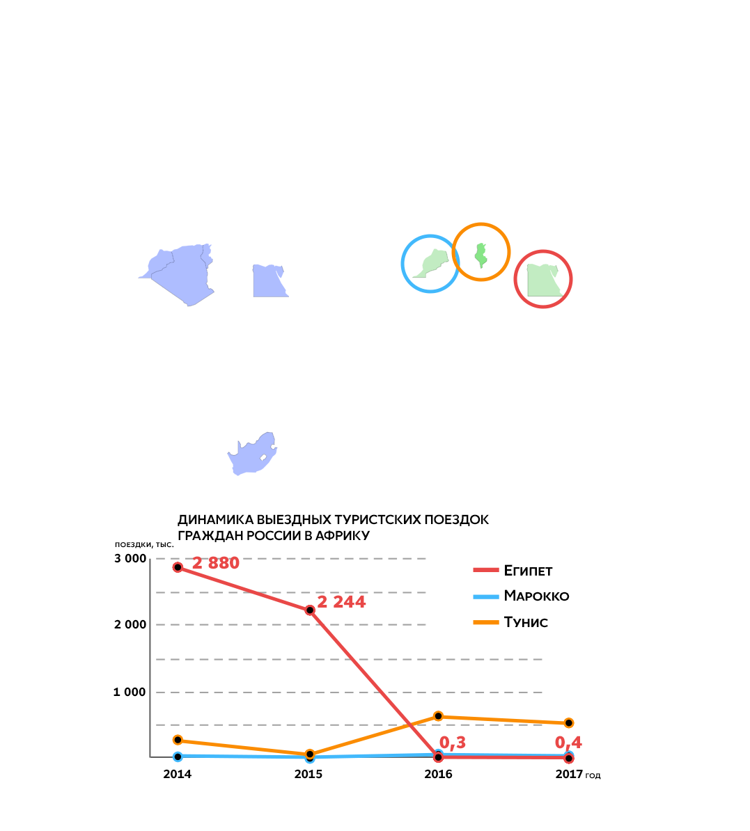 В целом Африка для туристов из России также не является востребованным местом отдыха, с 2014 года количество поездок сокращалось. Интерес представляли только Египет, Тунис и Марокко.